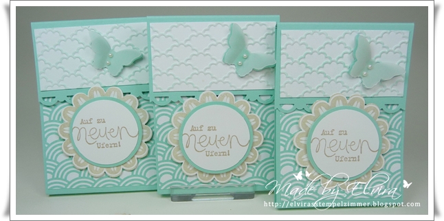 Die obere Lasche wurde mit dem Prägefolder Fächerfantasie (und leicht gewischt mit Aquamarin) verziert, darauf ein kleiner Schmetterling mit Transparentpapier und kleinen Perlen.