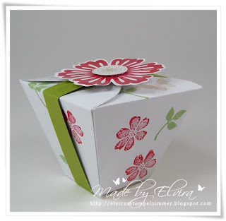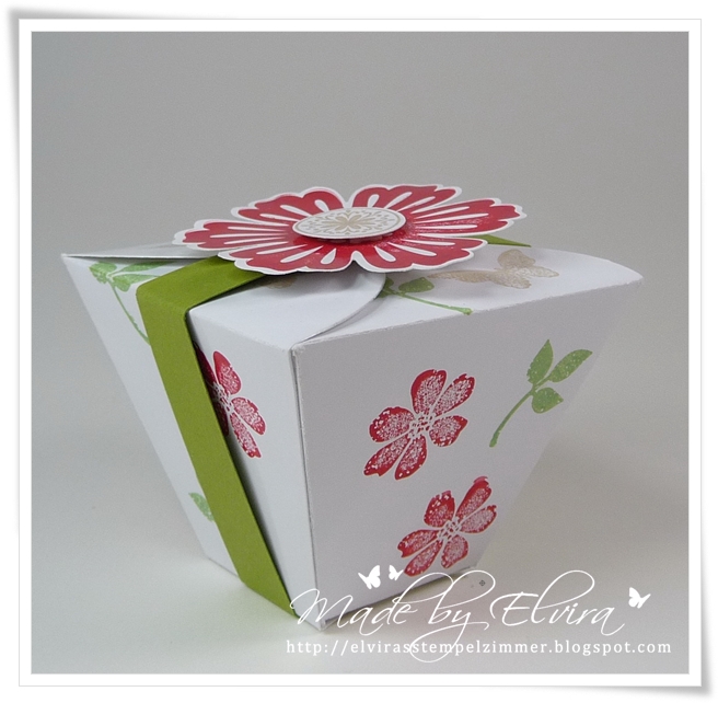 Eine weitere Möglichkeit ist diese Take-Out-Box. Bestempelt mit dem Stempelset Frühlingsgefühle, eine Banderole runderherum, oben drauf eine Blume aus dem Set Mixed Bunch, und mit dem passenden Blumenstanzer ausgestanzt. Und schon ist ein kleines Geschenk fertig.