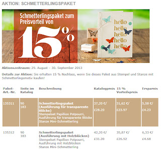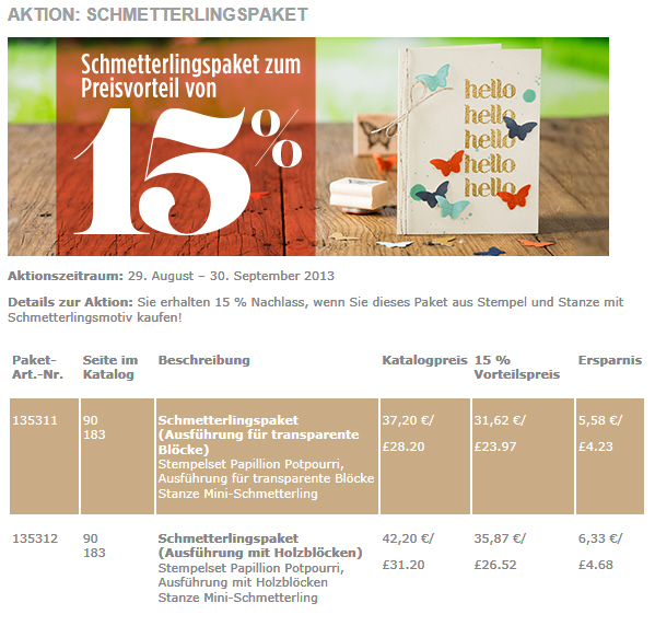 Das Set besteht aus dem Stempelset Papillion Potpourri und der Stanze für den Mini-Schmetterling. Hier spart ihr 15 % gegenüber dem Einzelverkaufspreis. Dieses Set könnt ihr ab sofort bestellen, die Aktion ist bis zum 30. September 2013 gültig!