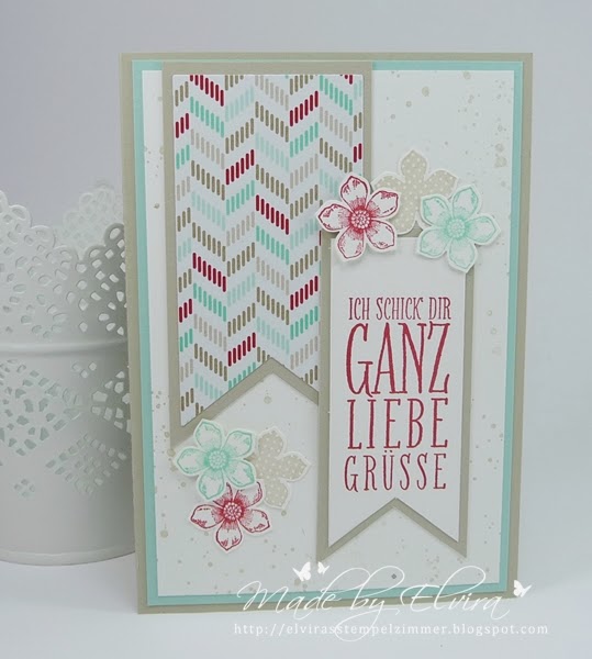 Der Hintergrund habe ich mit dem Set Gorgeous Grunge in Saharasand gestempelt, die lieben Grüße stammen aus dem Set Wimpeleien, und wurden in Glutrot gestempelt, und mit den passenden Framelits ausgestanzt. Ergänzt durch die kleinen Blümchen aus dem Set Petite Petals.
