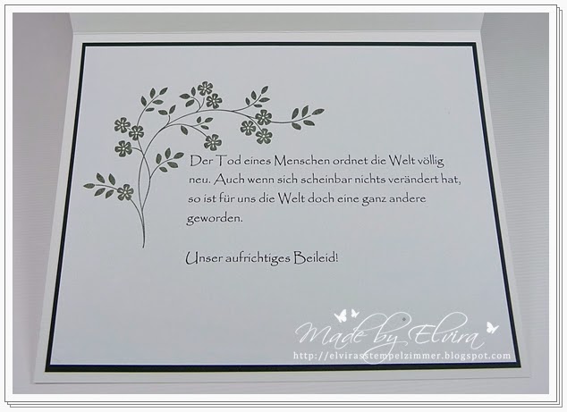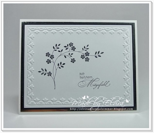 Die Grundkarte ist aus Cardstock in Flüsterweiß, darüber eine Lage in Silber und eine Lage aus schwarzem Cardstock. Die oberste Lage wurde mit dem Prägefolder Tulpenrahmen – übrigens diese Woche zu einem Superpreis im Angebot der Woche! – geprägt. Der Zweig stammt aus dem Set In Gedanken bei dir, und der Spruch aus dem Set Mit tiefstem Mitgefühl.