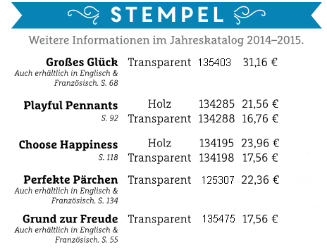 gibt es eine Auswahl an Stempelkissen, Papieren, Umschlägen und Klebemittel mit einem Preisnachlass von 15 %! Ausgewählte Stempel sind sogar mit einem Preisvorteil von 20 % erhältlich!