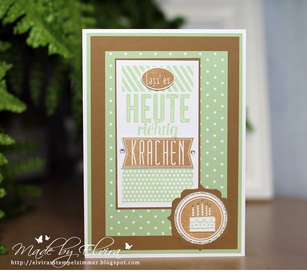 Eigentlich stammt dieser Spruch aus dem Stempelset  Geburtstagskracher. Ich habe ihn für diese  Geburtstagskarte in Kandiszucker und Pistaziengrün verwendet. Die kleine Torte ist auch bei dem Stempelset dabei. Bei den Kerzen habe ich mit dem Funkelzauber Glitzerkleber die Flammen etwas betont.