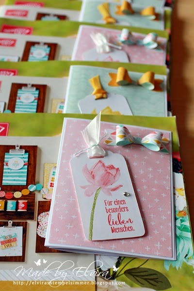 Für meine Kunden habe ich noch ein kleines Kärtchen mit Informationen zur Sale-A-Bration beigelegt. Verwendet habe ich dafür verschiedene SAB-Gratisprodukte (Papier, Stempelset, Band) sowie eines meiner Lieblinge aus dem Frühjahr-Sommerkatalog, die kleine Schleifenstanze (Mascherl).