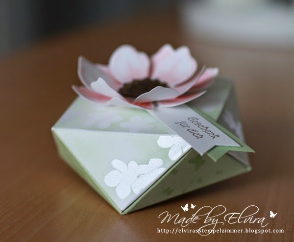 Gefertigt wird das kleine Ding mit dem Envelope Punchboard. Den Boden habe ich mit Kartenkarton in Pistazie gemacht, und mit den kleinen Schmetterlingen aus dem Stempelset Perpetual Birthday Calendar bestempelt – übrigens ein Mega-Geniales Set, perfekt für tolle Hintergründe. Der Oberteil ist mit dem wunderschönen, schimmernden Papier Zauberhaft aus der aktuellen Sale-A-Bration Aktion. Eingefärbt mit den Fingerschwämmchen in Pistazie. Oben drauf kam eine Blume, gestempelt in Kirschblüte und leicht eingefärbt mit dem Wassertankpinsel. Zwei kleine Fähnchen mit einem netten Spruch aus dem Set Perfekte Pärchen ergänzen die kleine Box.
