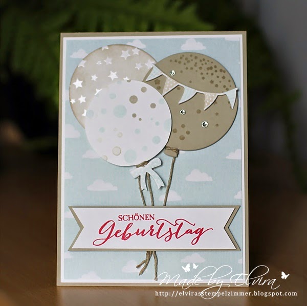 Genauso heißt das Stempelset, dass ich für diese Geburtstagskarte verwendet habe. Passend dazu gibt es auch die Framelits, so dass die Ballons superschnell ausgestanzt sind. Auch die kleine Wimpelkette und die kleine Schleife ist sowohl im Stempelset als auch bei den Framelits enthalten.