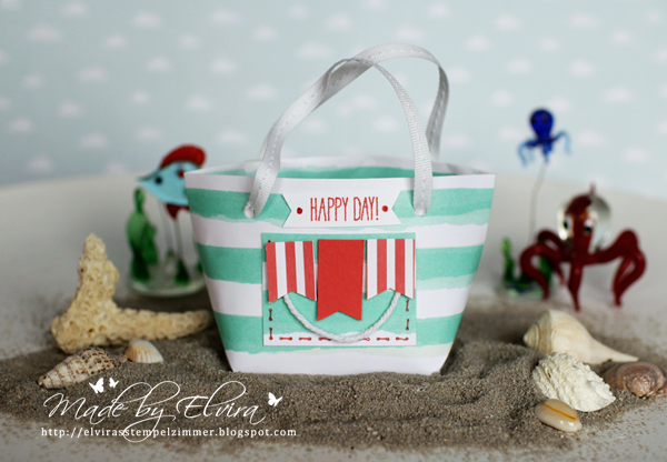 Da ich eine bekannte „Papierstreichlerin“ bin, d.h. ich kann mich nur sehr schwer überwinden, schönes, und vor allem neues Designpapier, anzuschneiden, habe ich für meine ersten Versuche Papier aus der letzten Sale-A-Bration Aktion verwendet. Und als ich das grün gestreifte Papier in der Hand hielt, kam mir sofort der Gedanke an eine Strandtasche. Also habe ich ein bisschen herumgetüftelt, und das ist dabei herausgekommen: