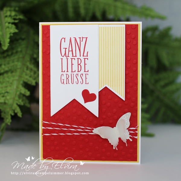 Der Gruß stammt aus dem Set Wimpeleien. Normalerweise steht in der obersten Zeile noch Ich schick´ Dir, das wollte ich aber nicht dabei haben, daher habe ich diese Zeile mit Masking Tape abgedeckt, den Stempel mit dem Stempelkissen eingefärbt und das Tape wieder abgezogen (funktioniert übrigens auch mit Post-It´s ganz gut). Der Streifenbanner, den ich auch in Gelb gestempelt habe, ist im Set Geburtstagskracher dabei. Beide Fähnchen sind mit den passenden Framelits ausgestanzt. Der Hintergrund wurde wieder geprägt, dieses Mal mit dem Prägefolder Punkteregen. Und weil Schmetterlinge immer passen, habe ich diese aus Glitterkarton und Transparentpapier mit der Handstanze eleganter Schmetterling ausgestanzt und mit Gluedots auf der Karte fixiert.