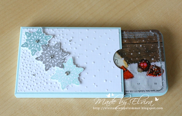 Die zweite Variante war in Himmelblau mit den schönen Schneeflocken aus dem Set Flockenzauber. Gestempelt in Lagunenblau, Himmelblau und embosst mit Prägepulver in silber. Der Hintergrund wurde mit dem Prägefolder Leise rieselt….. geprägt.