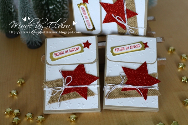 Die dritte Variante war relativ schlicht – in Savanne, mit geprägtem Sternen-Hintergrund, einem großen Stern aus rotem Glitzerpapier und einem Stück Juteband.