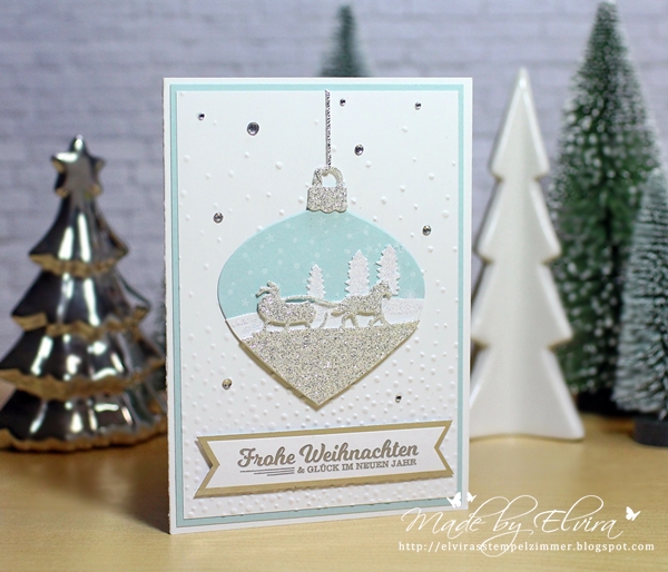 Auf die ausgestanzte Weihnachtskugel in Himmelblau habe ich mit der Craft-Tinte kleine Schneeflocken und Sterne gestempelt. Bäumchen und Pferdeschlitten wurden dann ausgestanzt, und passend zur Kugelform zugeschnitten. Die Weihnachtswünsche aus dem Stempelset Fröhliche Feiertage habe ich wieder mit Prägepulver in Silber embosst, und mit einem Banner aus silberfärbigem Karton hinterlegt. Zum Schluss noch ein paar Strass-Steinchen für´s obligatorische Bling-Bling 😉