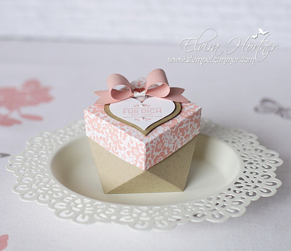 Als kleine Aufmerksamkeit zum Valentinstag habe ich diese Diamantboxen gebastelt. Entstanden sind sie mit dem Falzbrett für Geschenktüten (Gift Bag Punchboard). Ich finde sie durch die außergewöhnliche Form ganz bezaubernd. Das schöne Papier aus dem Block Liebesblüten hat es mir so richtig angetan. Diese pastelligen Farben sind ja ganz nach meinem Geschmack, und Kirschblüte mit Savanne kombiniert ist sowieso ein Hingucker.